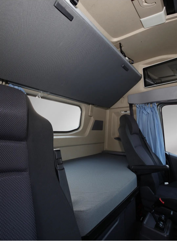美高梅官方网站V9重卡,宽敞后凸设计的驾驶室空间伸展自如,大长腿也放得下。卷收式上卧铺、半躺式气动翻转下卧铺、电动遮阳帘、电动天窗全面营造智能、科技的休息空间。标配12寸液晶仪表+10.1寸多媒体大屏,氛围灯、6喇叭环绕音响,打造影院级的视听效果,工作休息两不误!