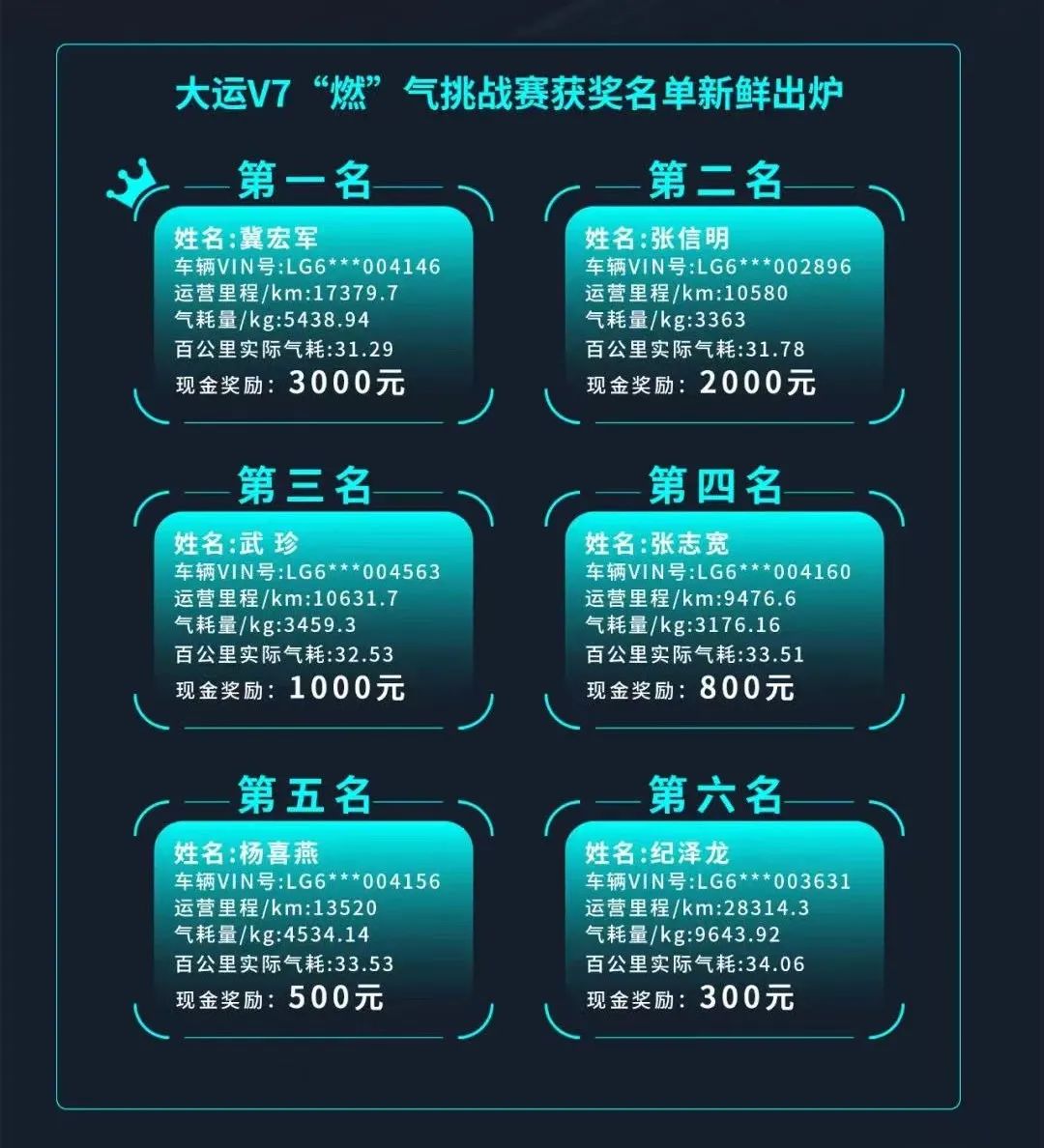 为确保本次比赛的公平、公正、公开,所有参赛选手车辆的赛前赛后数据均由专业设备采集,经过一个月的角逐,孰强孰弱已知分晓,获奖名次公布如下: