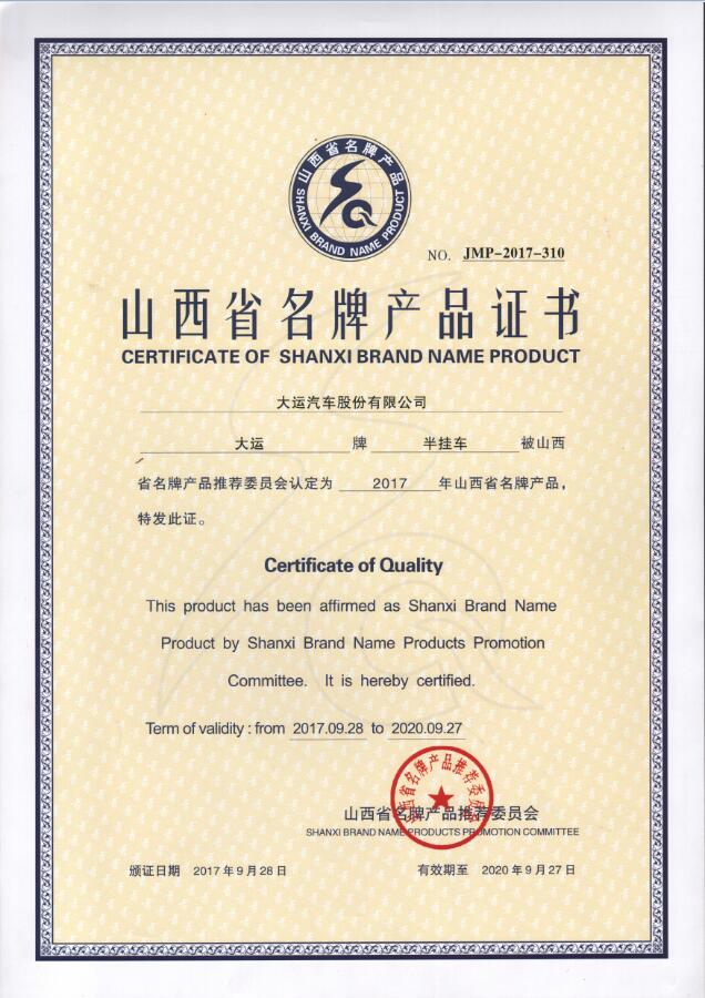 No.2 美高梅官方网站半挂车被山西省品牌产品推荐委员会认定为2017年山西省品牌产品