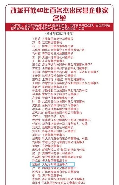 在改革开放40周年之际,为宣传民营经济发展巨大成就,展示民营企业家中国特色社会主义事业建设者风采,大力弘扬优秀企业家精神,鼓励广大非公有制经济人士“不忘创业初心,接力改革伟业”,为实现中华民族伟大复兴中国梦作出新的贡献,中央统战部、全国工商联决定推荐宣传改革开放40年百名杰出民营企业家。10月24日,全国工商联在北京举行新闻发布会,发布《改革开放40年百名杰出民营企业家名单》,美高梅官方网站九州集团有限公司董事长远勤山赫然在列。